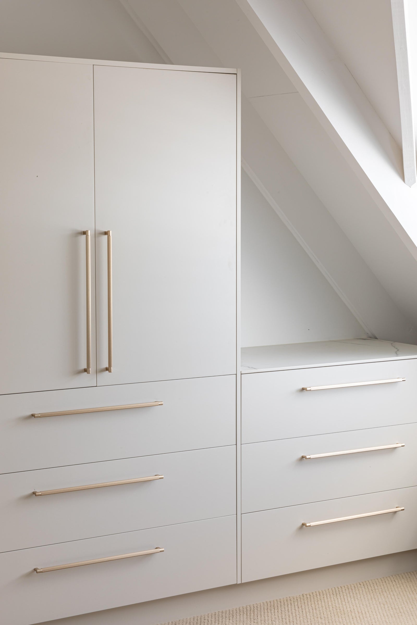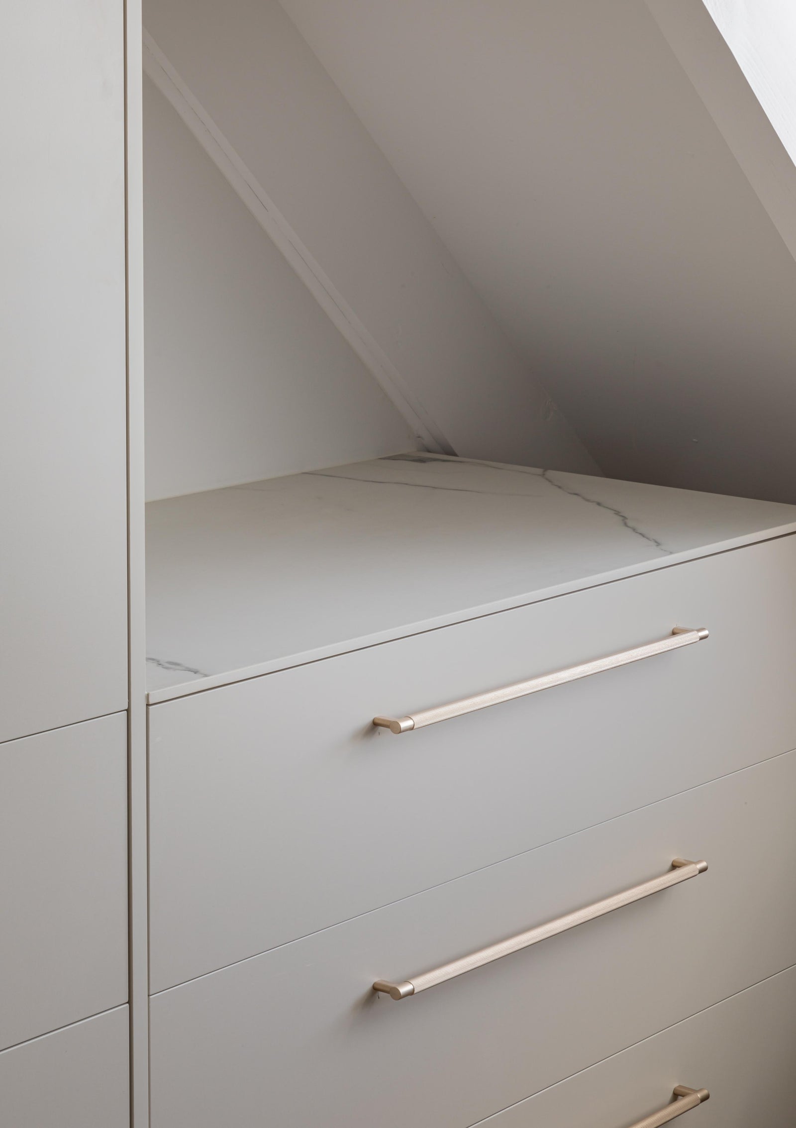 This home embraces a clean, modern aesthetic where considered details define the overall design. Central to this approach are the Archant Fade handles in brushed brass, selected for their sleek, linear profile and understated elegance. Their refined finish introduces warmth and subtle contrast, enhancing the cabinetry without overpowering the space.
