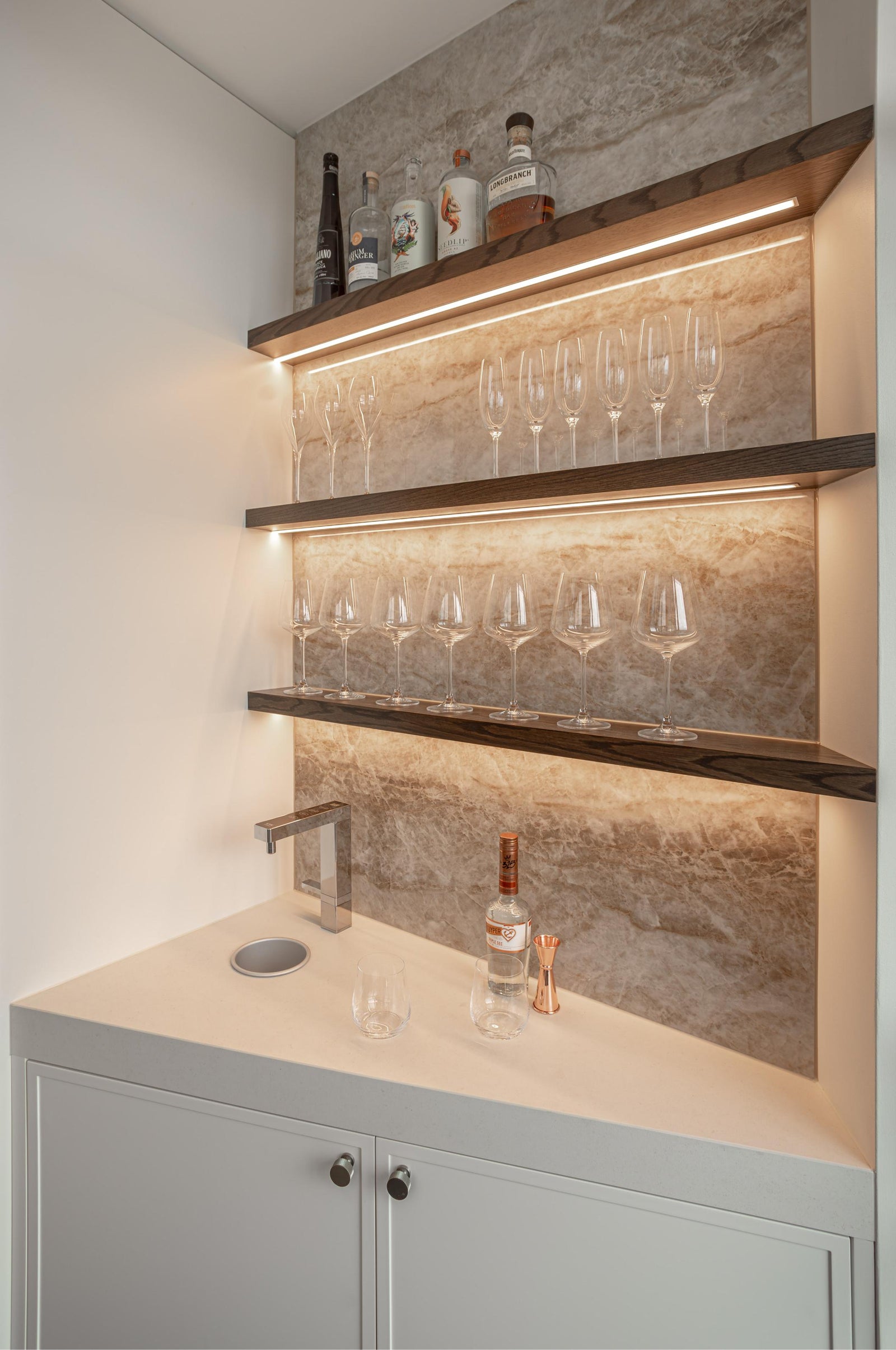 Central to this approach are Archant’s Berkley and Fade handles, chosen for their ability to balance classic form with contemporary restraint. The Berkley handles and knobs introduce a sense of heritage and elegance, offering subtle detailing that brings depth and familiarity to the cabinetry. Their presence adds a traditional note, grounding the space and reinforcing its timeless appeal.