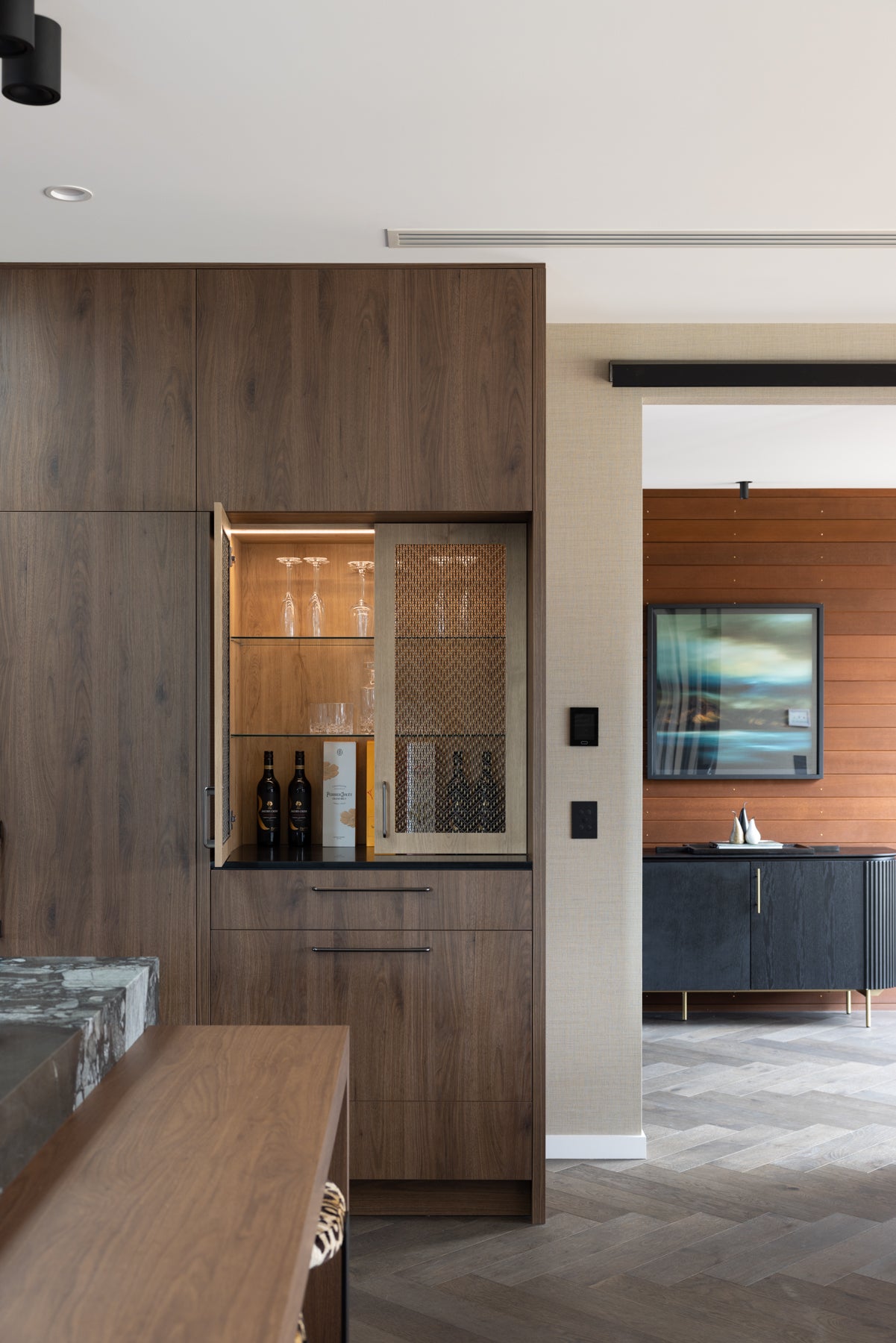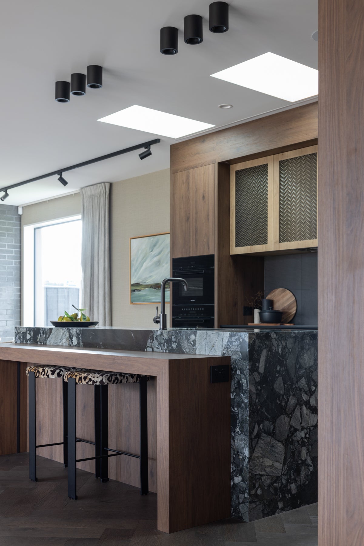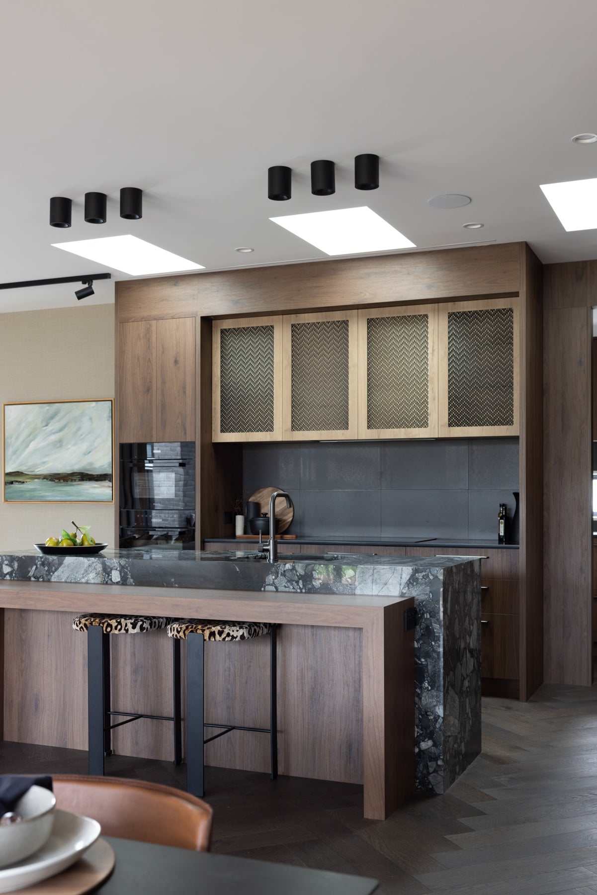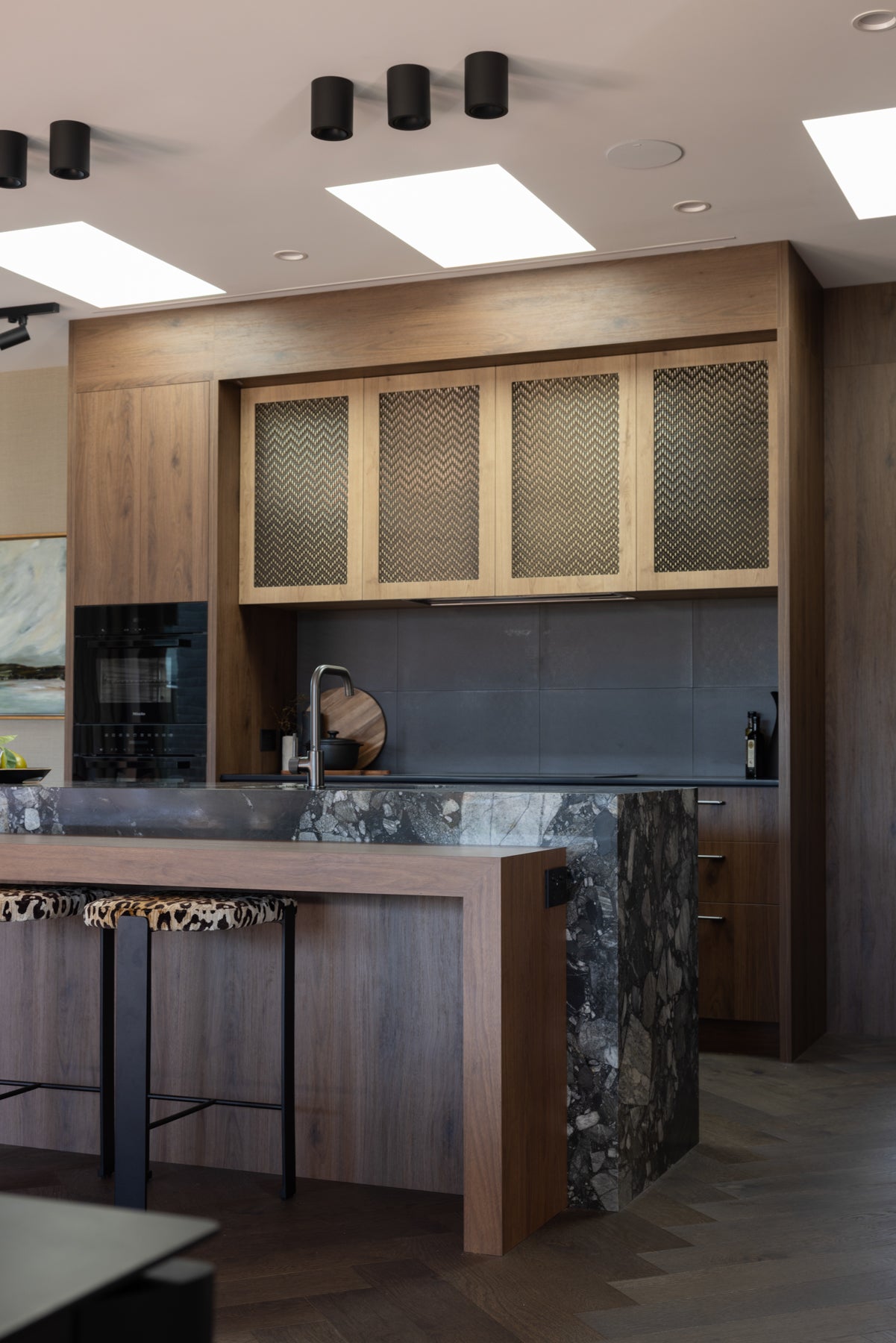 The Staten Antique Brass Wovenpanel design by Archant creates a striking statement on these kitchen fronts, seamlessly blending texture, warmth, and sophistication. The intricately detailed woven panel adds depth and character to the space, enhancing both aesthetics and functionality. Its open-weave design allows for subtle ventilation while maintaining a refined, elegant look that elevates the overall kitchen design.